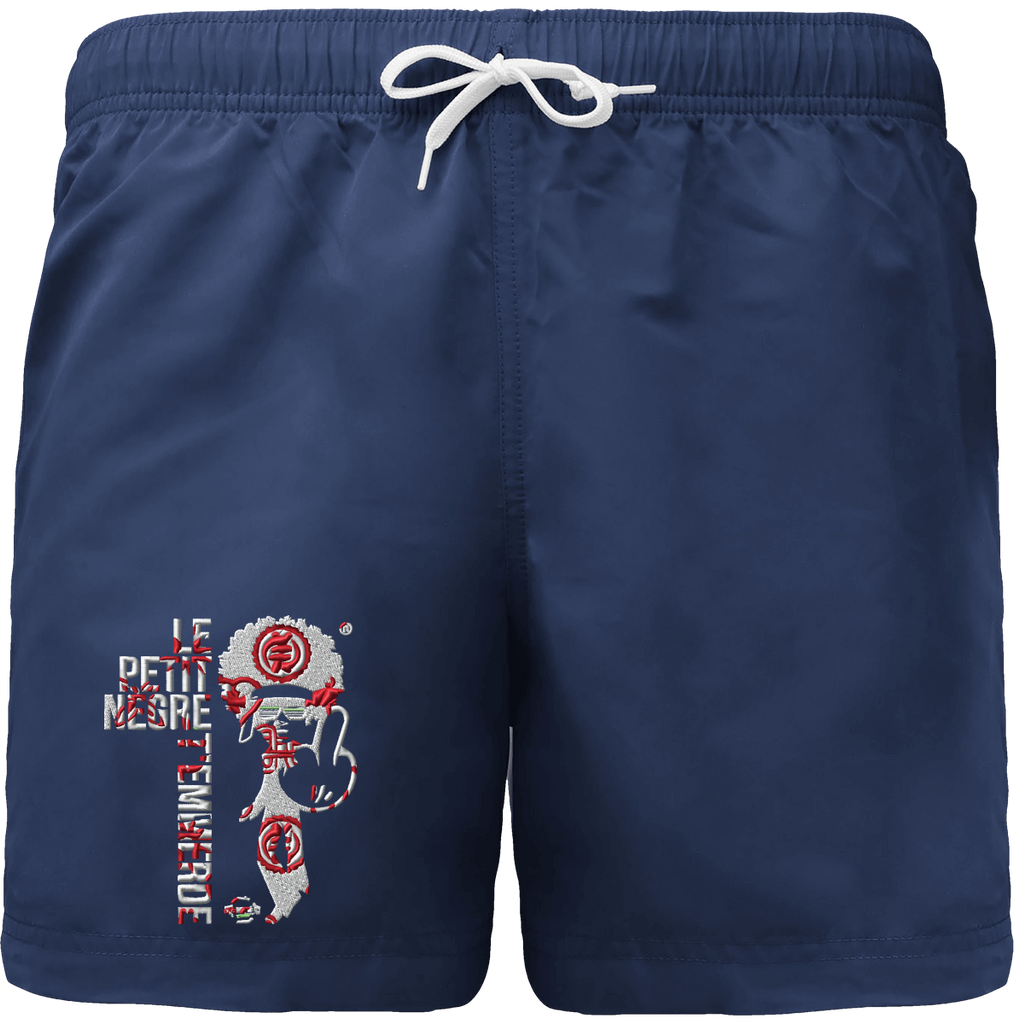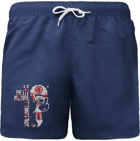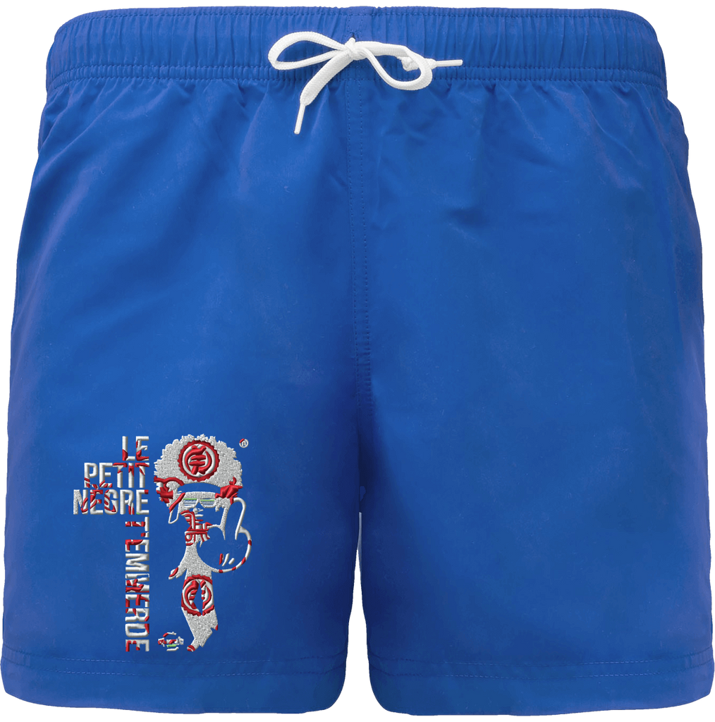 Short de bain en 100% polyester. Tissu à séchage rapide et toucher peau de pêche. Ceinture élastiquée avec cordon de serrage contrasté. Slip intégré en maille filet. short avec 1 poche plaquée arrière fermée par une bande auto-agrippante. Grammage de 110 g/m².